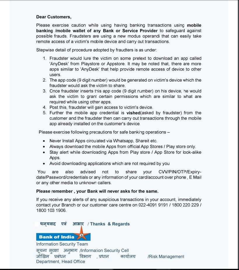 - आपला वापरकर्ता आयडी, पासवर्ड, कार्ड तपशील आणि एटीएम पिन इ. साठी आपल्या बँकेने जारी / कॉल केलेल्या कोणत्याही ई-मेल किंवा टेलिफोन कॉलला प्रतिसाद देऊ नका. त्यांना फिशिंग/विशिंग प्रयास असे म्हणतात. बँक ऑफ इंडियामध्ये, आम्ही आमच्यावर टाकलेल्या विश्वासाचा सन्मान करतो आणि कोणत्याही हेतूसाठी ईमेल किंवा फोन कॉलद्वारे अशी वैयक्तिक माहिती कधीही घेणार नाही.