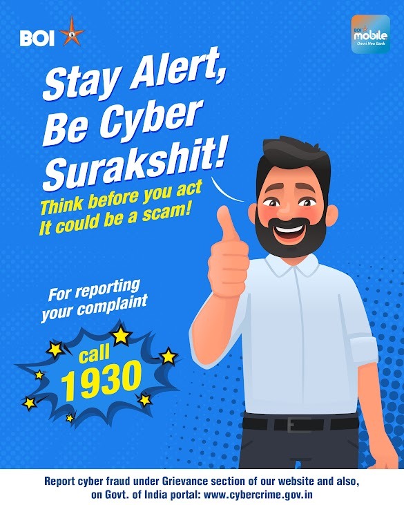 ਚੌਕਸ ਰਹੋ! ਧੋਖਾਧੜੀ ਨੂੰ ਰੋਕੋ! ਵਧੇਰੇ ਜਾਣਕਾਰੀ ਲਈ ਸੁਰੱਖਿਅਤ ਬੈਂਕਿੰਗ ਸੈਕਸ਼ਨ 'ਤੇ ਜਾਓ। 'ਸ਼ਿਕਾਇਤ ਸੈਕਸ਼ਨ' ਤਹਿਤ ਸਾਈਬਰ ਧੋਖਾਧੜੀ ਦੀ ਰਿਪੋਰਟ ਕਰੋ। ਸਰਕਾਰੀ ਪੋਰਟਲ www.cybercrime.gov.in ਕਰੋ ਜਾਂ 1930 'ਤੇ ਕਾਲ ਕਰੋ