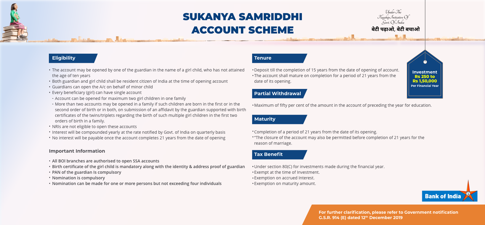 - ਇਹ ਖਾਤਾ ਕਿਸੇ ਸਰਪ੍ਰਸਤ ਦੁਆਰਾ ਇੱਕ ਅਜਿਹੀ ਕੁੜੀ ਦੇ ਨਾਮ 'ਤੇ ਖੋਲ੍ਹਿਆ ਜਾ ਸਕਦਾ ਹੈ, ਜਿਸਦੀ ਉਮਰ ਦਸ ਸਾਲ ਤੋਂ ਘੱਟ ਹੈ।